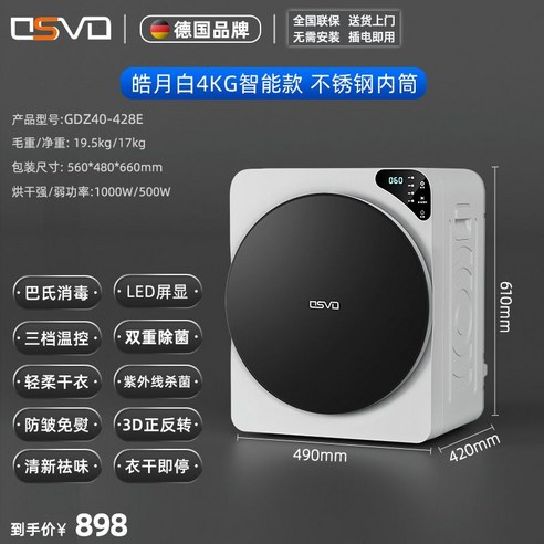 독일 OSVO 의류 건조기 가정용 소형 드럼 형 4kg 속옷 소독 살균 고속, Haoyue 백색 4KG 지적인 모형 + 두 배 살균