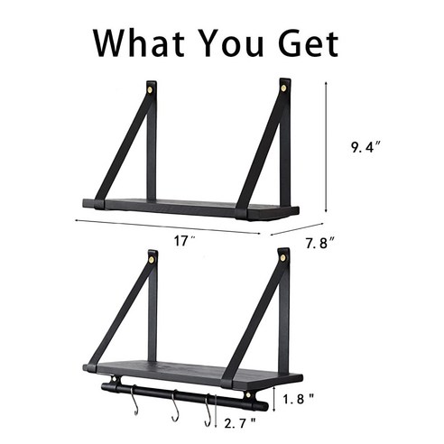 FRIADE 벽걸이 나무 플로팅 선반 다기능 PU 가죽 스트랩 보관 선반 .. 정품보장, Matt Black